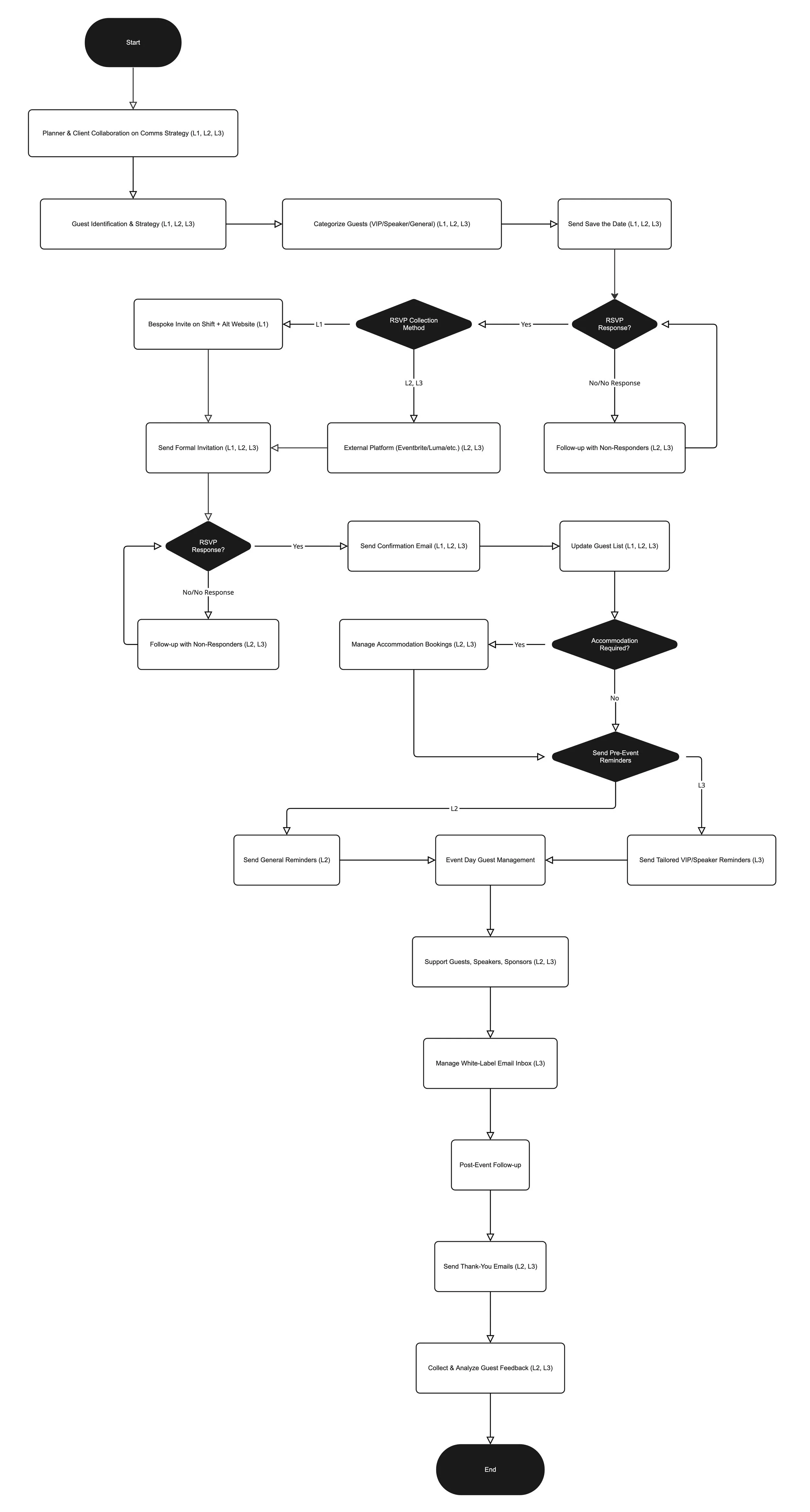The flowchart below gives a full picture of what happens behind the scenes, from the first guest interaction to post-event follow-up. It illustrates how Shift + Alt Events manages communications between planners, clients, and guests at every stage, so you can see how it all fits together.